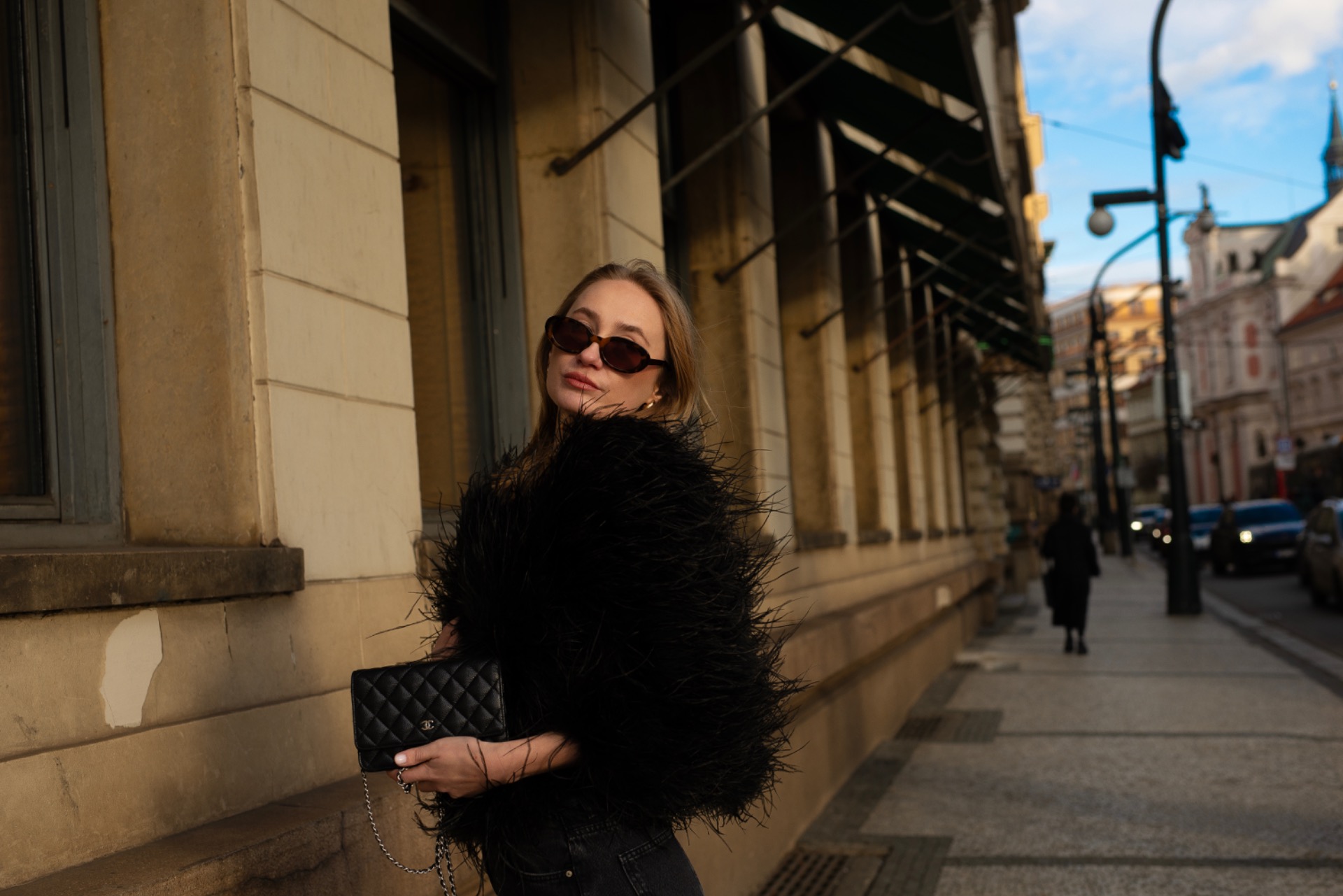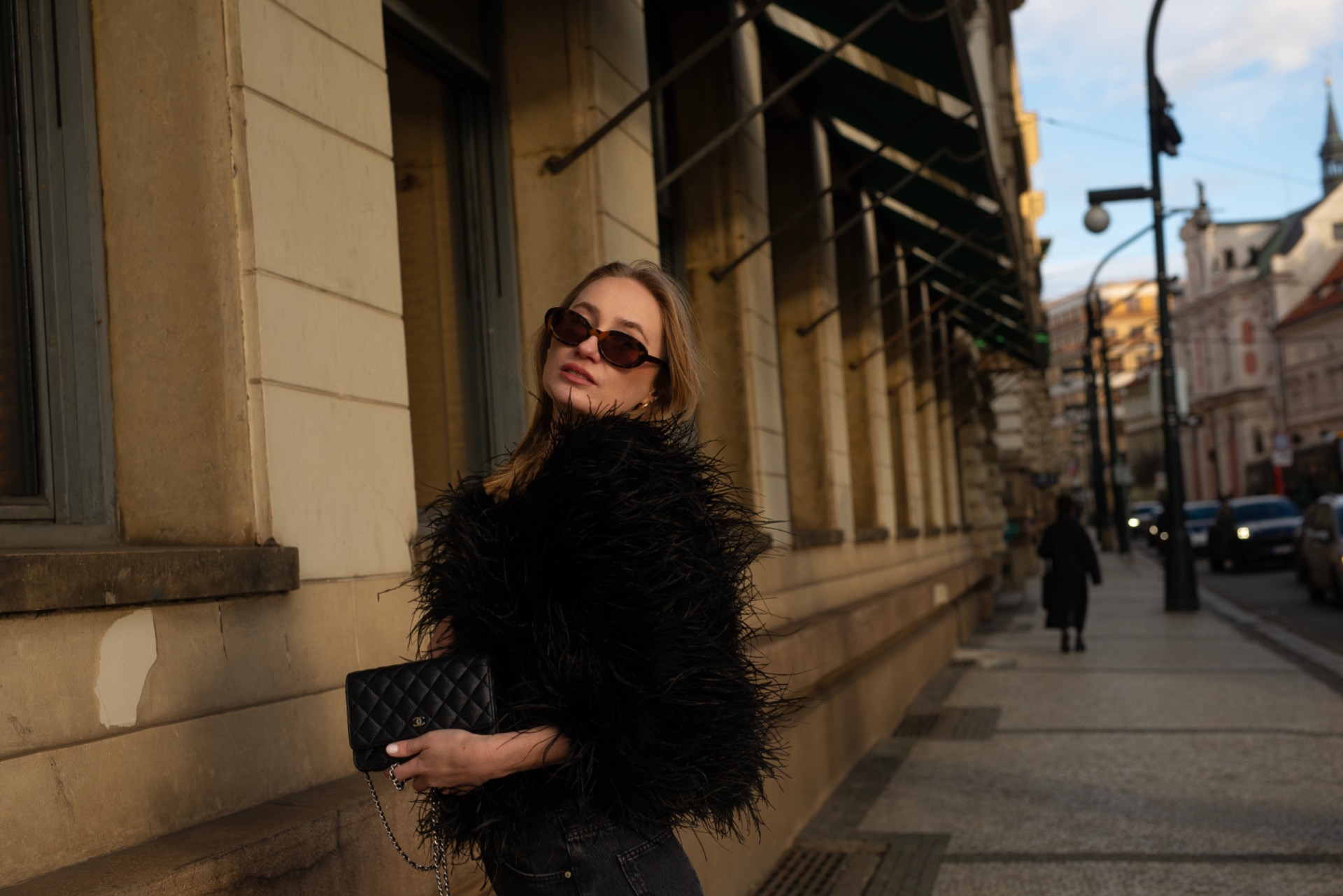 The Alina coat is a lightweight piece crafted from ostrich feathers, designed as a bold, decorative element that elevates any outfit. The fluid movement of the feathers adds texture and dynamism, creating a refined yet striking visual statement.