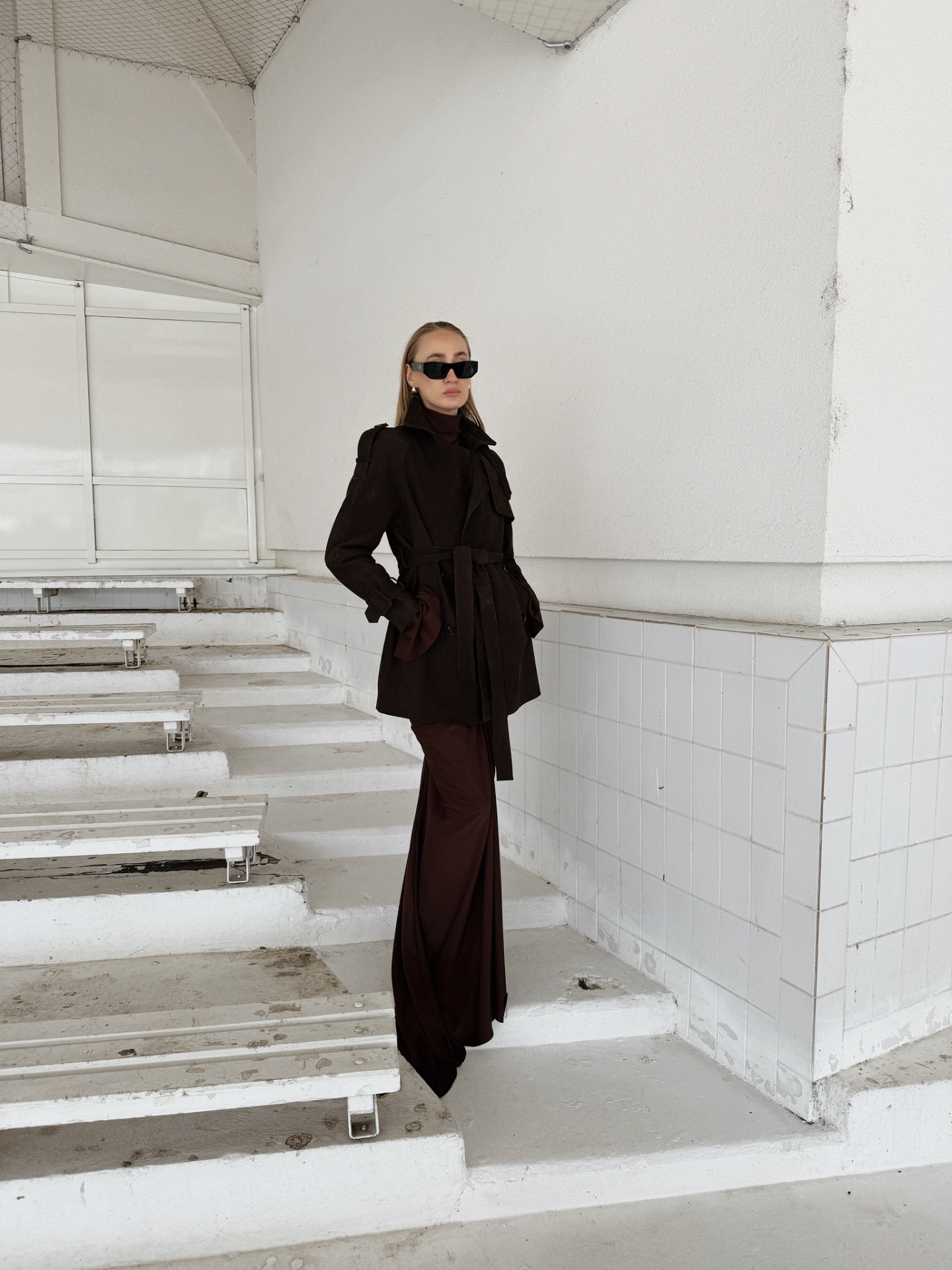 Měkká kůže se přirozeně přizpůsobuje tělu. Díky absenci ramenních vycpávek materiál volně splývá a jemně formuje siluetu. Zavazování v pase dodává bundě lehkou strukturu, aniž by narušovalo její minimalistický charakter.