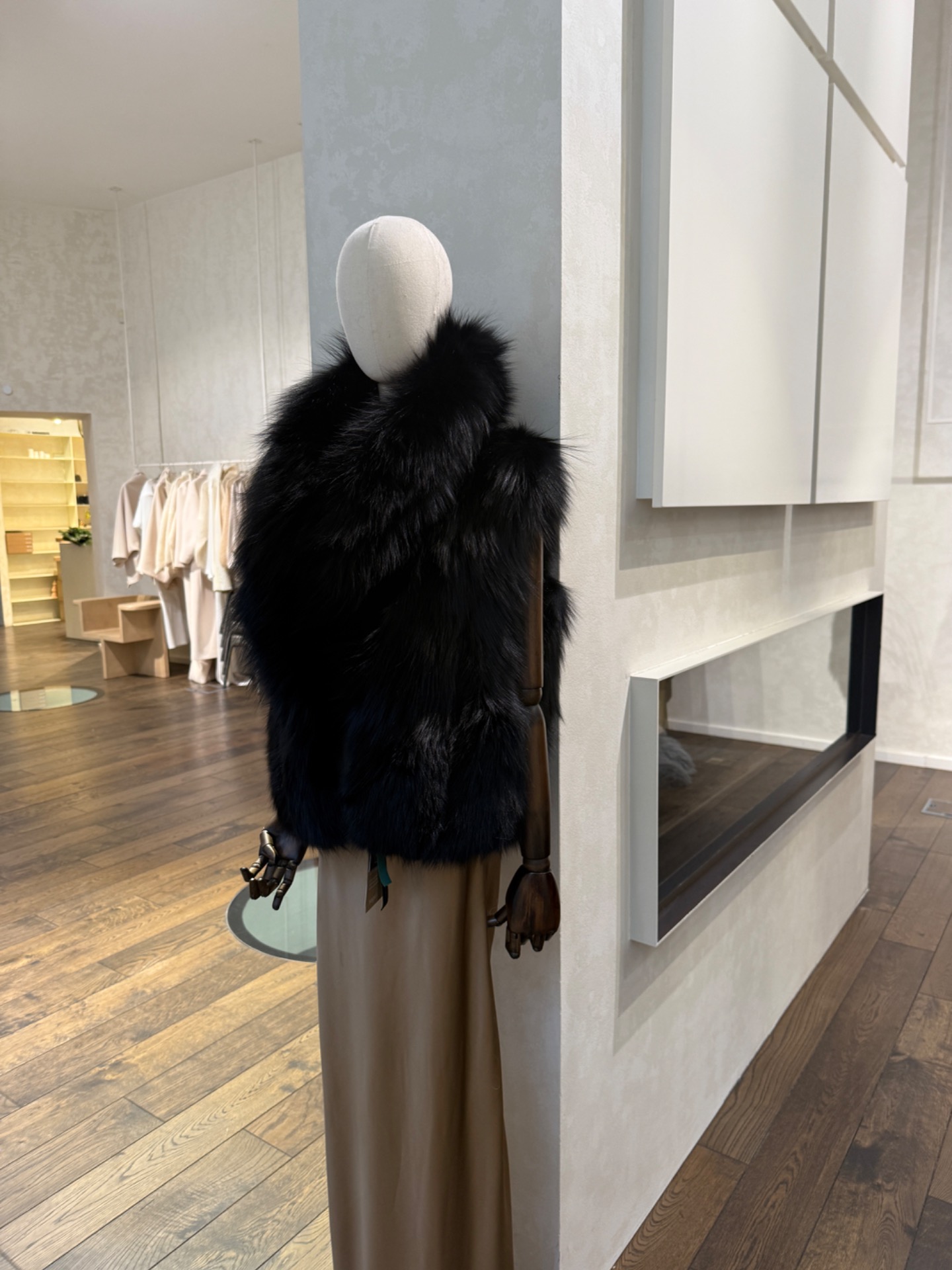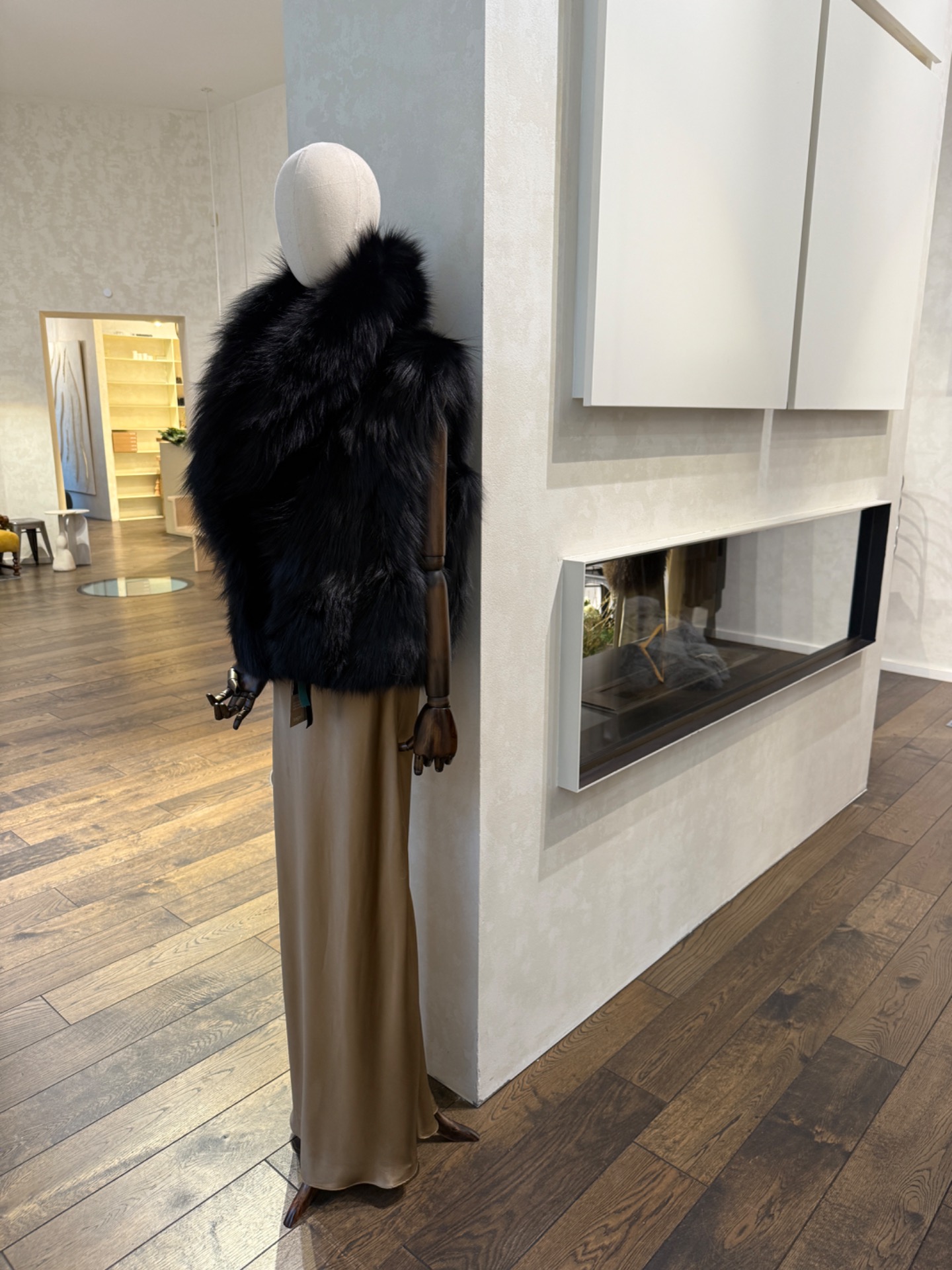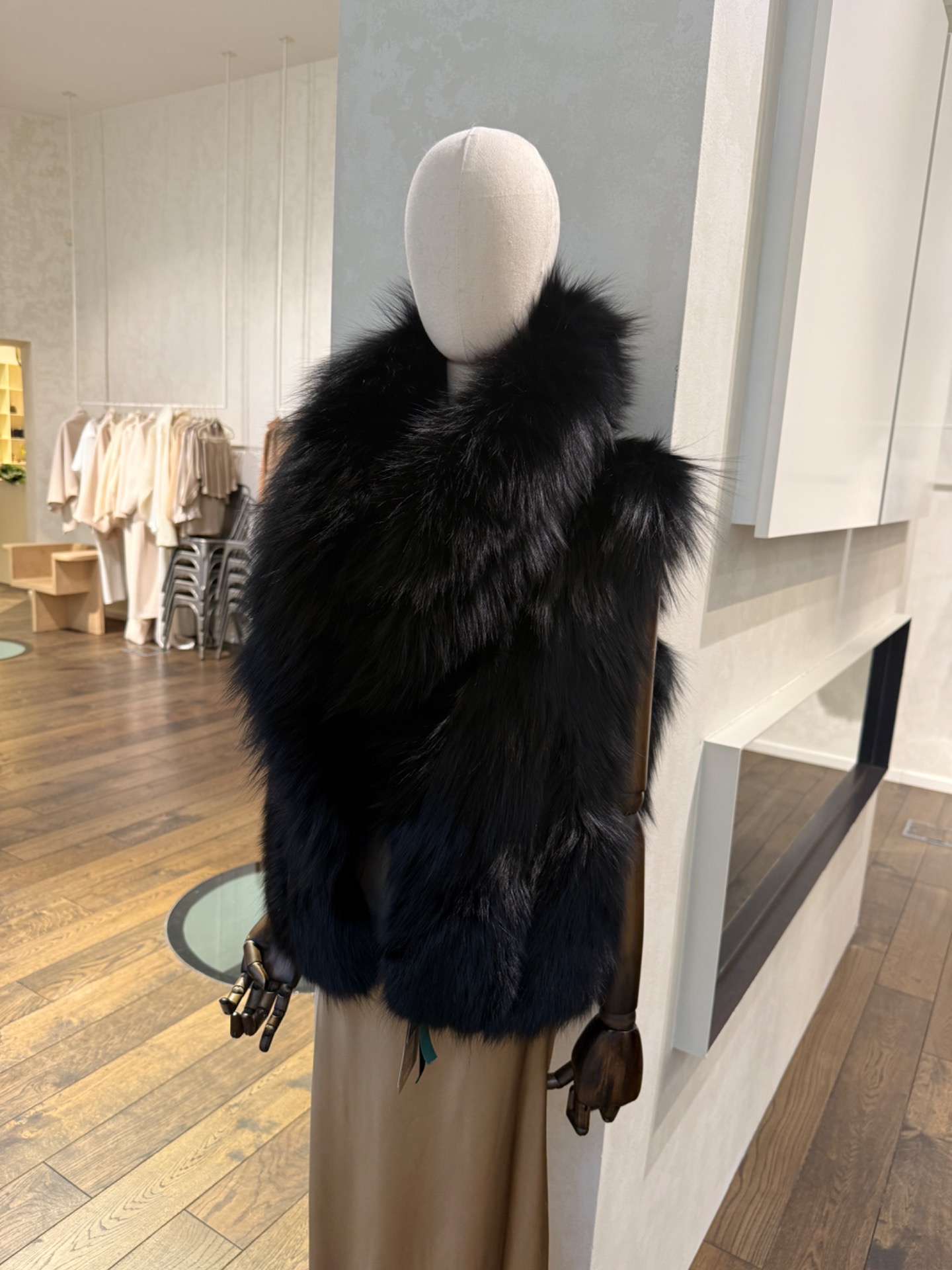 Elegantní vesta z certifikované černé Saga stříbrné lišky zaujme na první pohled svým mohutným, luxusně tvarovaným límcem. Precizní zpracování podtrhuje nadčasovou siluetu a výrazný objem kožešiny, který dodává modelu exkluzivní charakter.