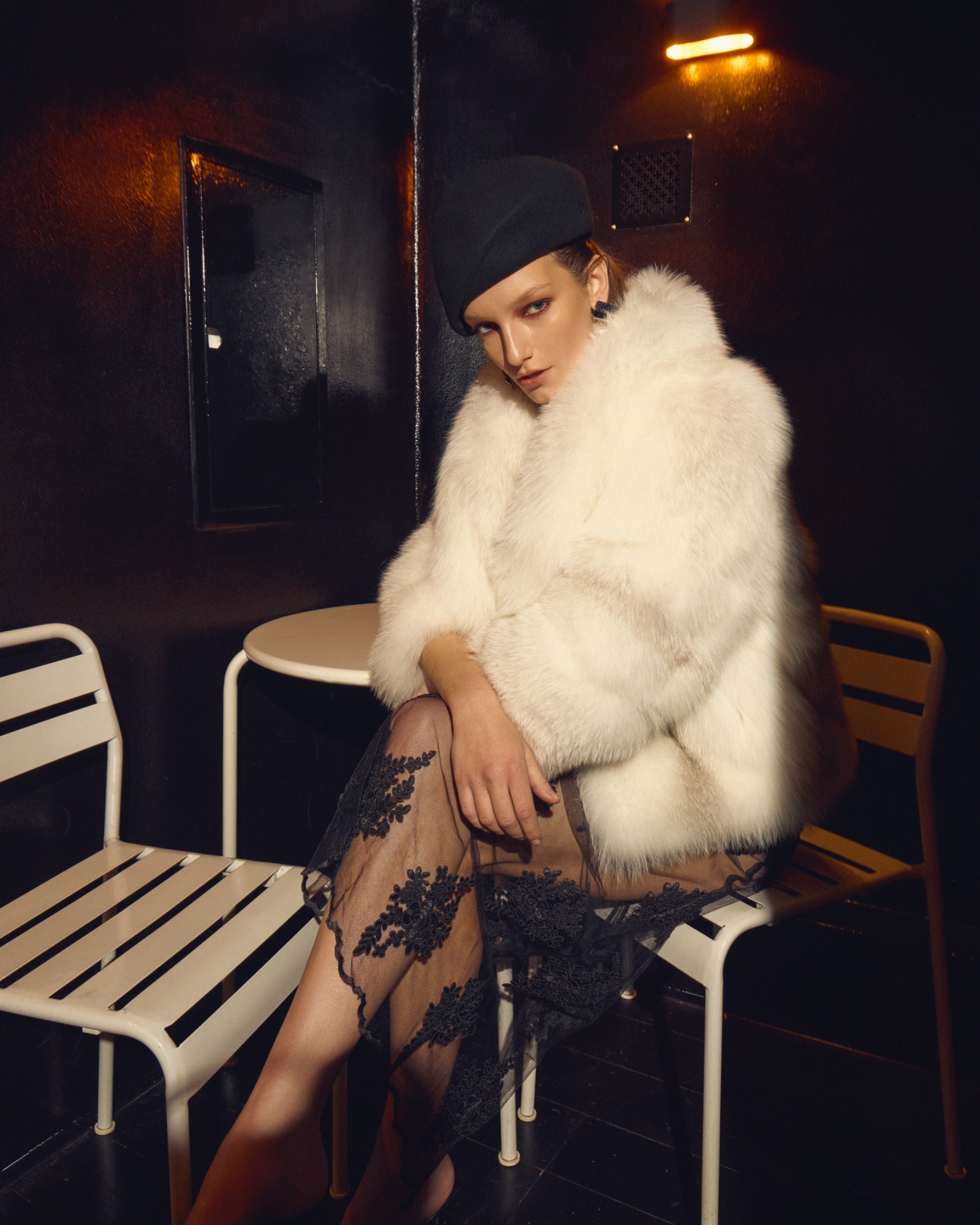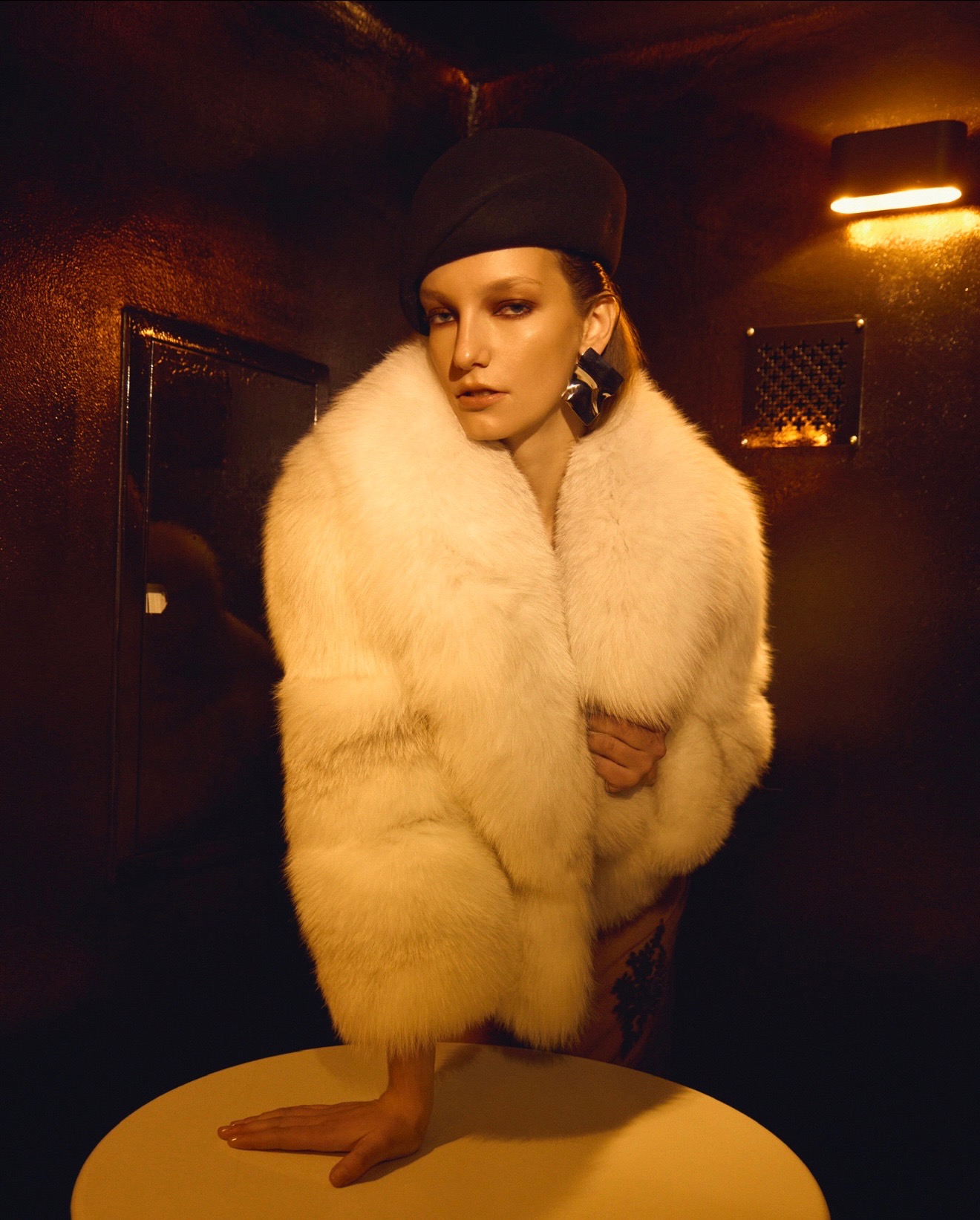 The Antoinette fur coat is a refined couture piece crafted from certified natural white cross fox fur. Its voluminous collar and elegant silhouette highlight the purity of the material and the timeless character of couture craftsmanship.