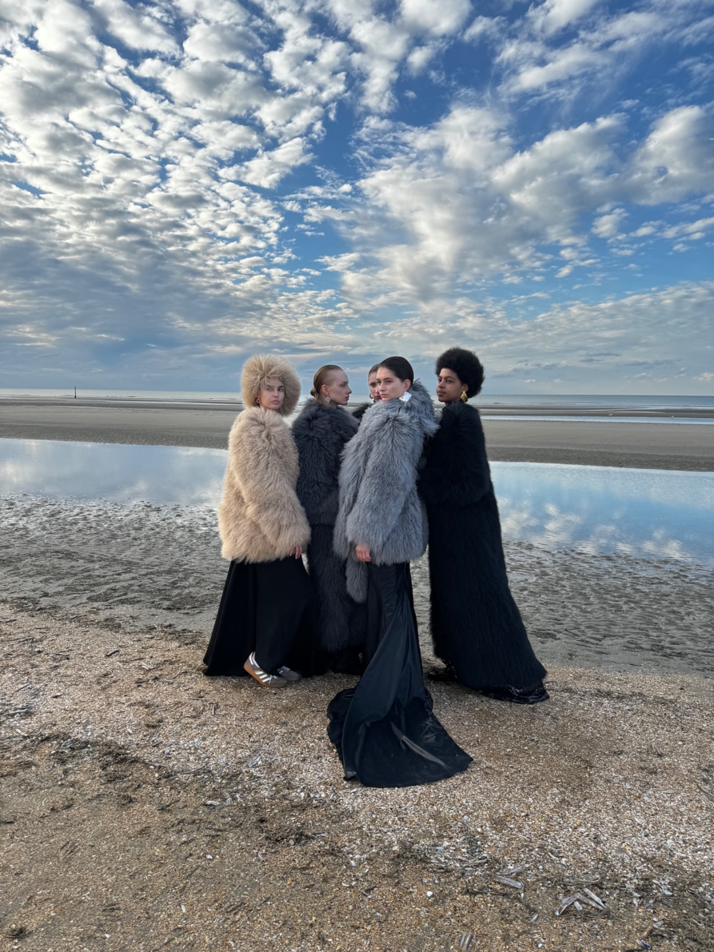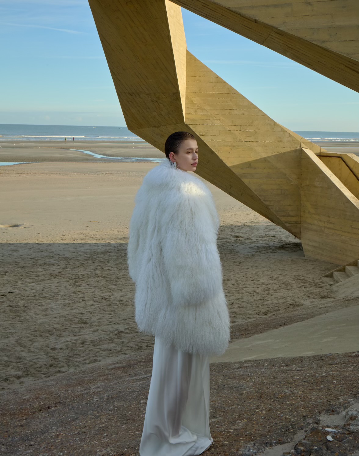 This Mongolian lamb fur coat, cut to a 80 cm length, is designed as an elegant ready-to-wear piece with an emphasis on lightness and a naturally balanced silhouette. The folded collar visually frames the shoulders and softens the overall shape, creating a refined and feminine line.