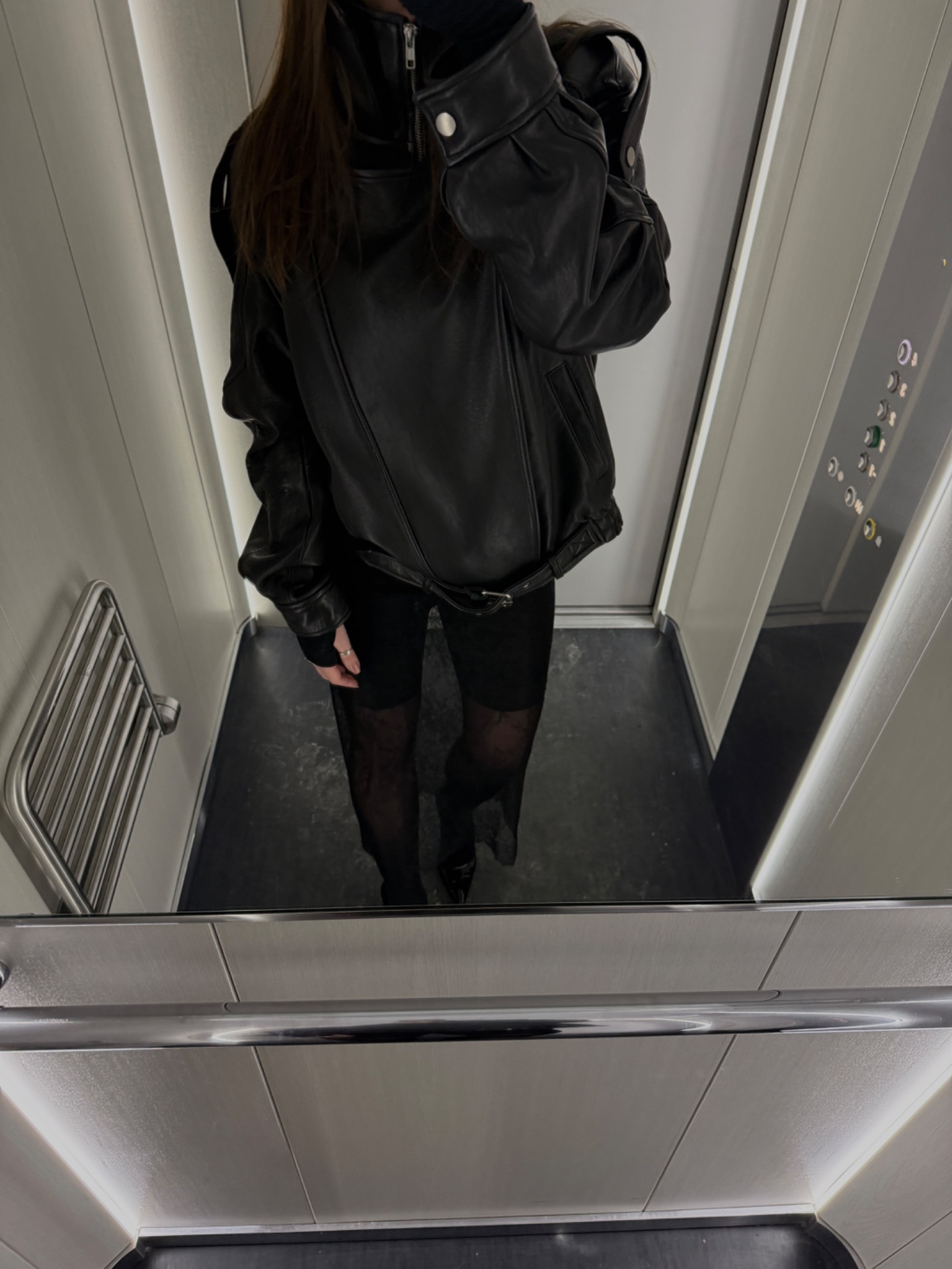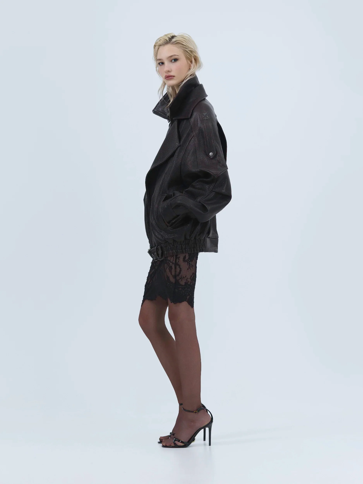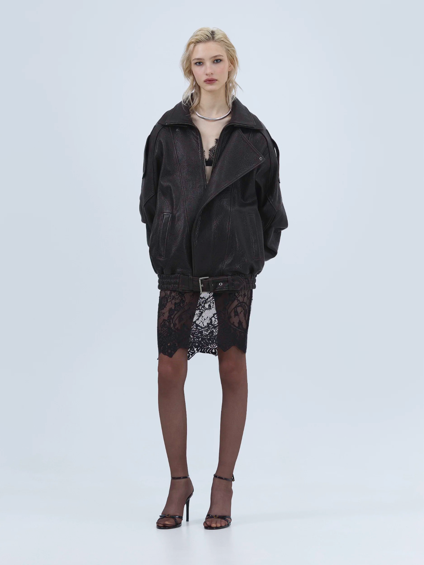 An oversized leather jacket crafted from supple lamb leather with a subtle vintage finish. The voluminous silhouette with dropped shoulders is defined by a bold leather belt at the hem, adding structure and character. Zip fastening and a silk-viscose lining ensure everyday comfort.