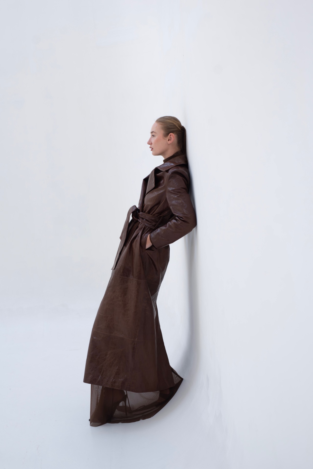 The Meda trench coat is crafted from oiled lambskin leather and designed as a clean, minimalist piece free from unnecessary embellishment. Timeless proportions and refined construction define this elegant silhouette, making it a sophisticated wardrobe staple.