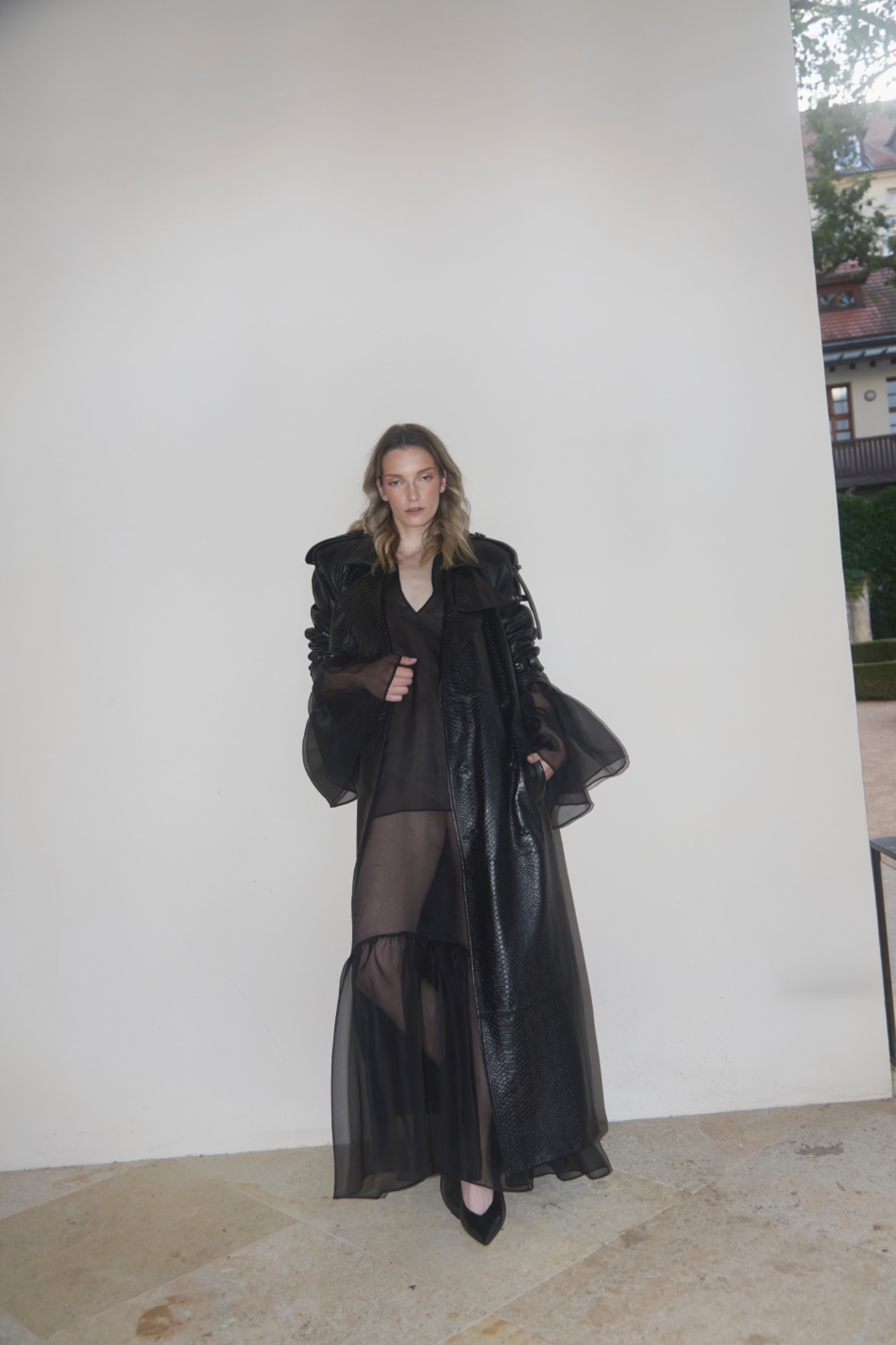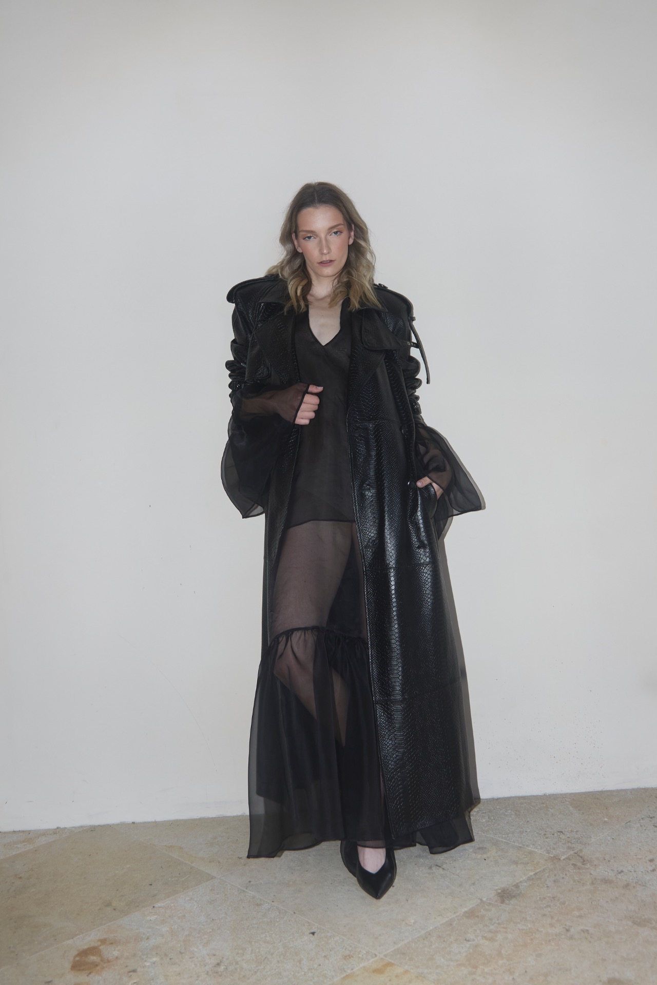 The Veronica trench coat is crafted from structured, embossed leather with an exotic motif, creating a bold and unmistakable impression. Precise tailoring combined with architectural details shapes a powerful silhouette that has been a defining signature of the brand for many years.