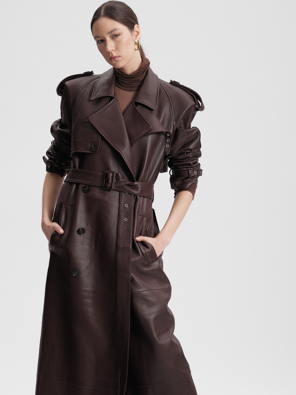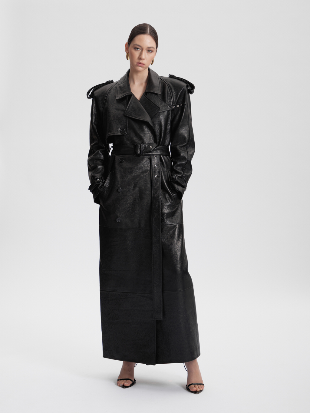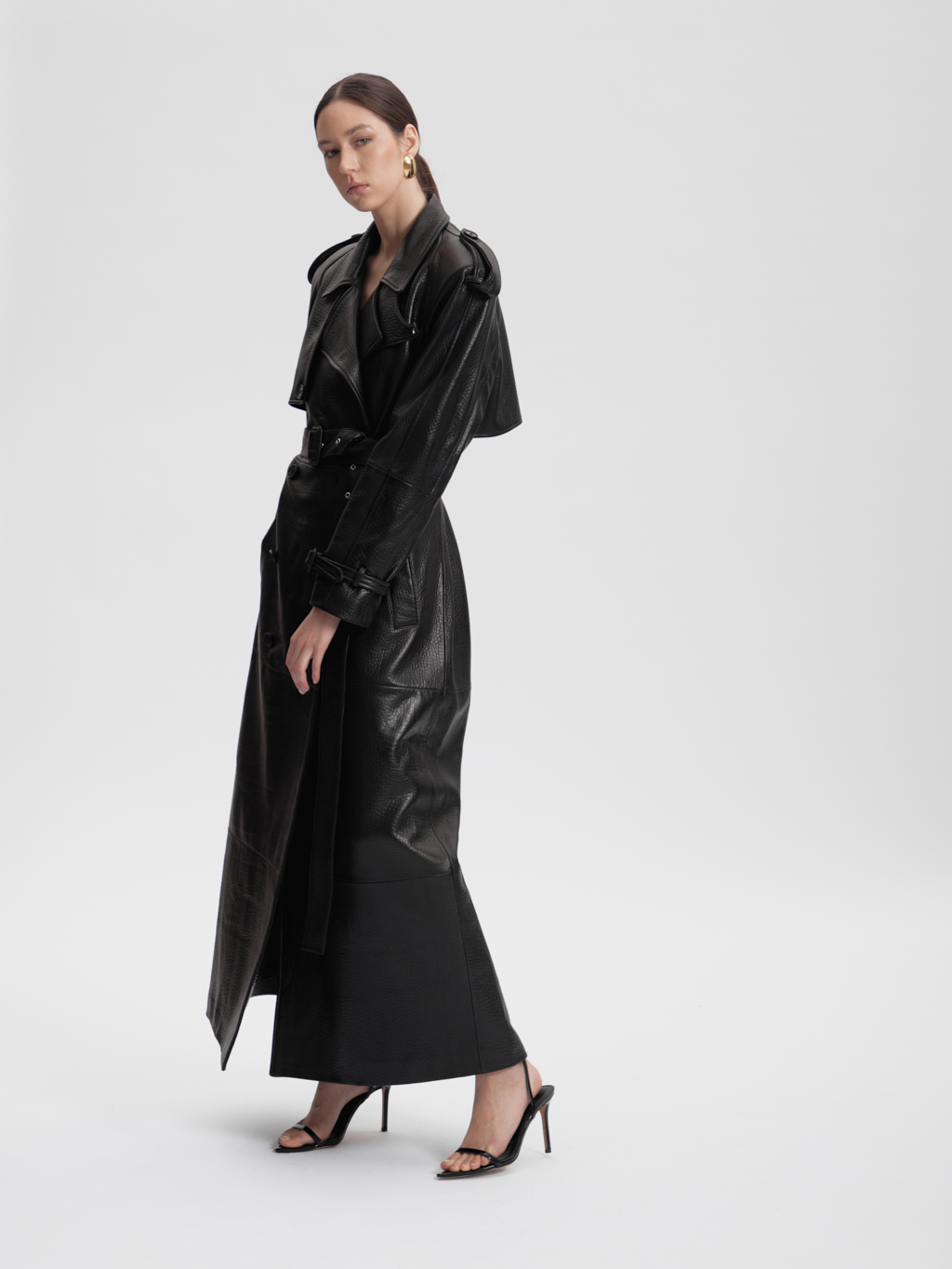 The Veronica trench coat is crafted from top grain leather, creating a bold and unmistakable statement. Clean tailoring meets architectural detail, resulting in a powerful silhouette that has defined the brand for years.