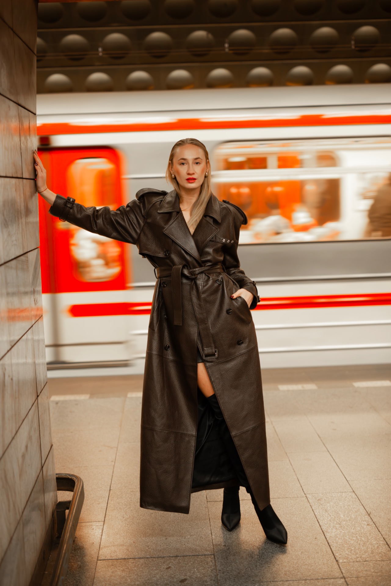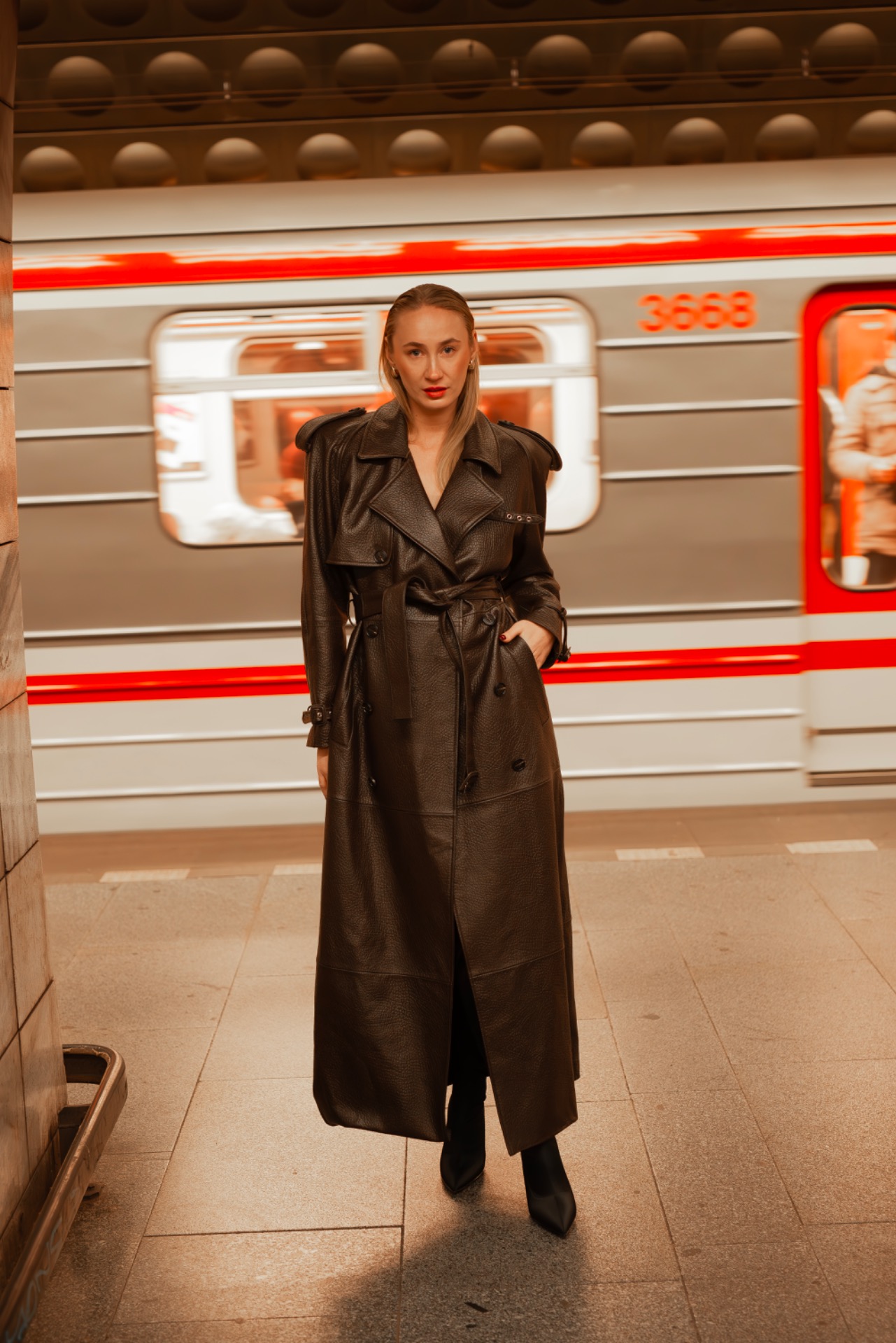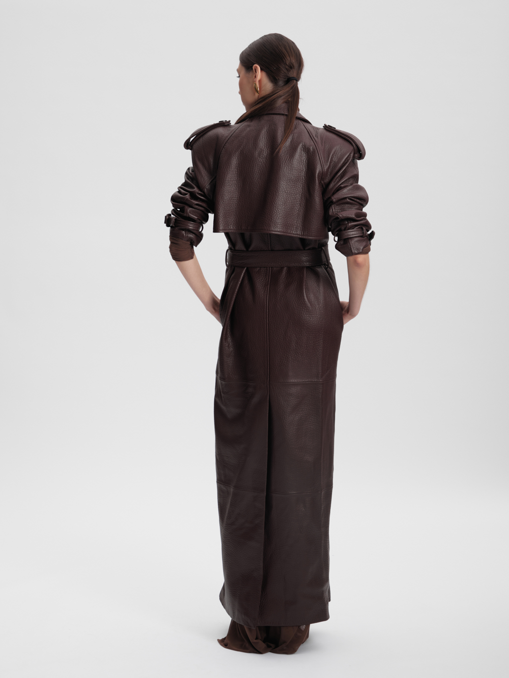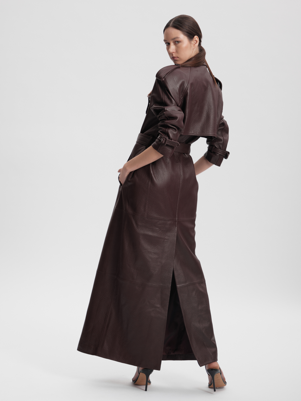 The Veronica trench coat is crafted from top grain leather, creating a bold and unmistakable statement. Clean tailoring meets architectural detail, resulting in a powerful silhouette that has defined the brand for years.
