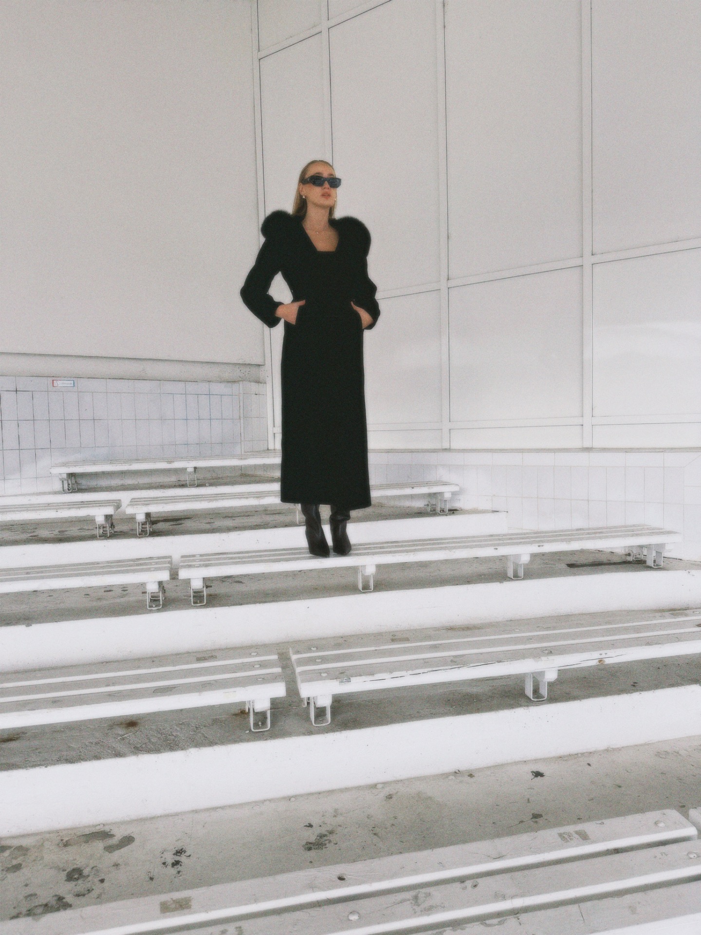 The coat is adorned with a removable trim made of Finnish fox fur, adding a luxurious accent. It can also be ordered without the fur detail for a clean, minimalist look.