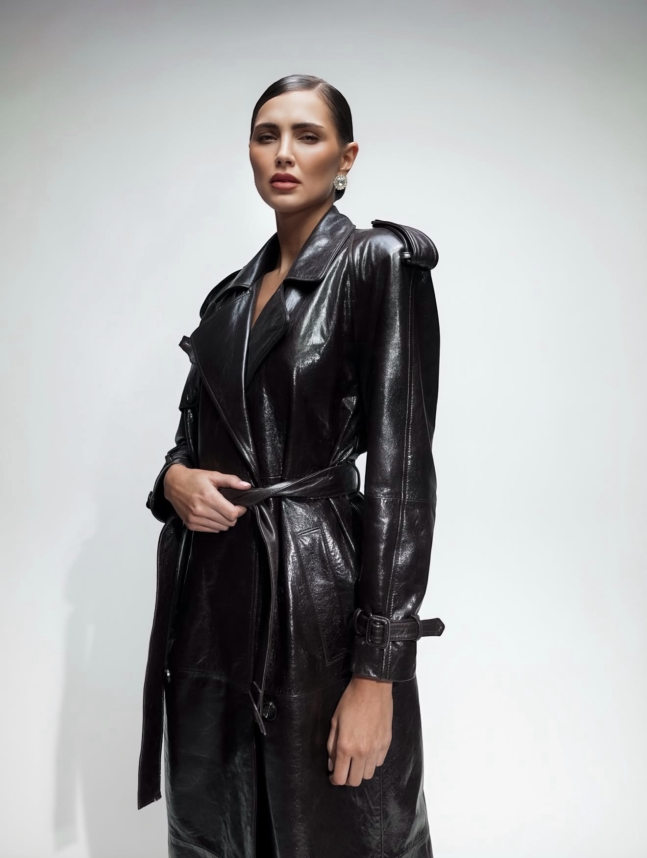 Dvouřadé zapínání spolu se zavazováním v pase přináší vyváženost a strukturu, zatímco ramenní vycpávky dodávají modelu dramatický a sebevědomý výraz. Veronica je nadčasový kabát navržený tak, aby vynikal sezónu za sezónou.